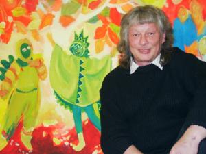 Igor Rutter vor dem noch nicht fertig ausgemalten Tabaluga-Bild